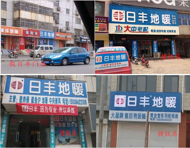 如下為真假日豐門頭對(duì)比,大家仔細(xì)看就能辨別真?zhèn)?,授?quán)店的門招藍(lán)色部分一律是“標(biāo)志 日豐地暖”,而且不會(huì)打與品牌無(wú)關(guān)的字樣,其他字樣一般打在下面白色部分,要求門招上面不允許打任何競(jìng)品字樣,而且藍(lán)色部分與白色部分的比例為2:1